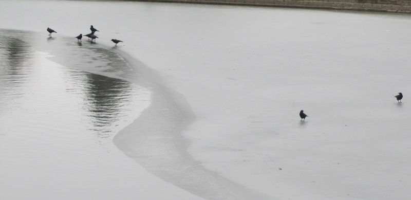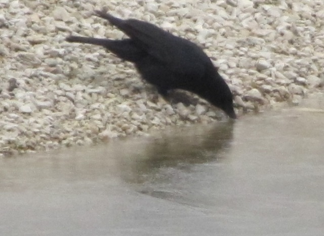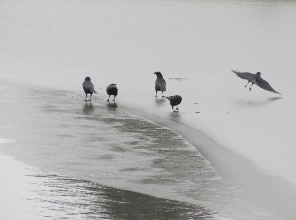 I noticed some crows out on the frozen edge of our lake. One crow apparently wanted to approach to drink but it was chased away by some others. It flew over to Duckie Beach instead and drank from there.