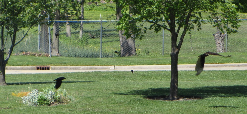 In this photo one can see one of the crows in pursuit as well as a swallow in the background.