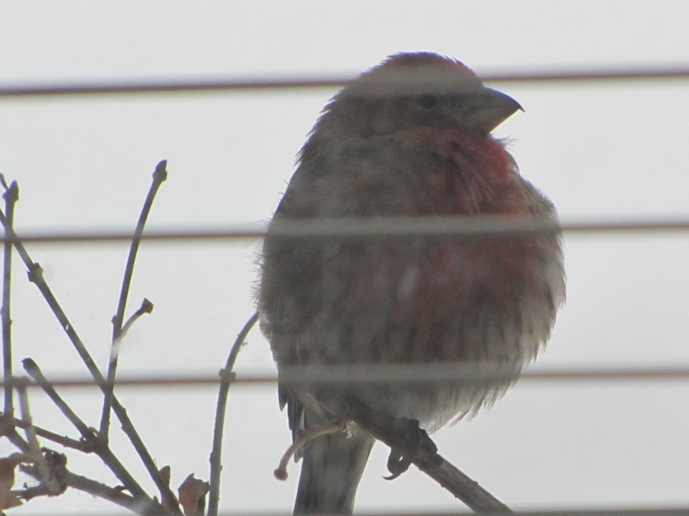 The sparrows are also very skittish. The usual mix at the plate are purple finches (seen in the next photo), junkos and house sparrows. The sparrows fly away as a group anytime they see us move inside. But we were able to take pictures and my partner sat at his desk right by the plant pots and they stayed for a good part of the day.