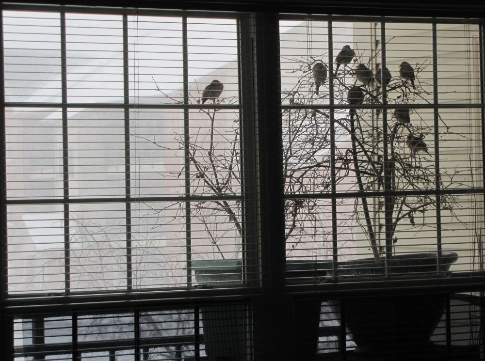 During the snowstorm 2 weeks ago, we woke up Thursday morning to this sight on our balcony. This was very unusual. Despite the lilacs being out there for over a decade, we rarely have the birds exploring them, much less perching in them.