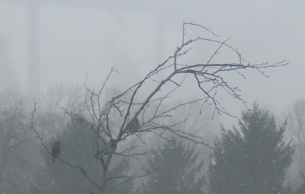 The food plate is right below the lilacs and the windows leach heat in the winter, so we've often had mourning doves hanging around on the shelves near the windows. But this was a first, even though it is so much cozier a spot than where they usually are. I guess it says something about the wind and temperatures as this was probably the first heavy snow this generation has seen.
