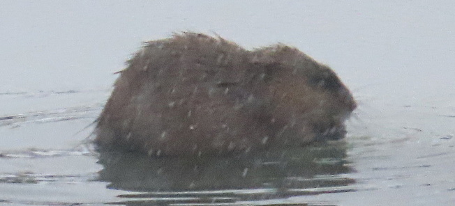 A few weeks ago it snowed lightly for some 12 hours. We noticed that there was a dark lump on the lake next to the ice hole created by the lake's aerators. In looking more closely we saw it was one of our resident muskrats, using it to feed. You can see it nibbling in the second photo with the snowflakes going by it.