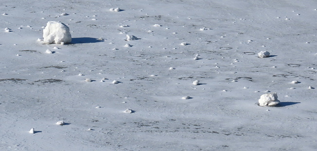 Date: 2025-01-27 02:07 am (UTC)Could they be points where windswept snow accumulated? Perhaps there was a slight dip in the ice so particles of snow rested there. Then additional snow accumulated around the core. There was just enough sun to melt the snow, but it was still below freezing. So it iced together.